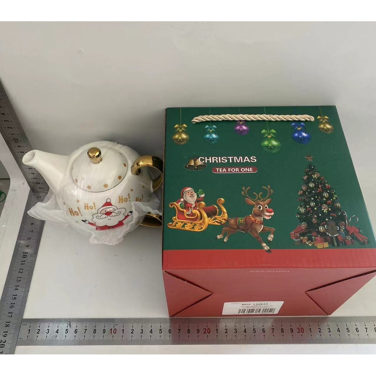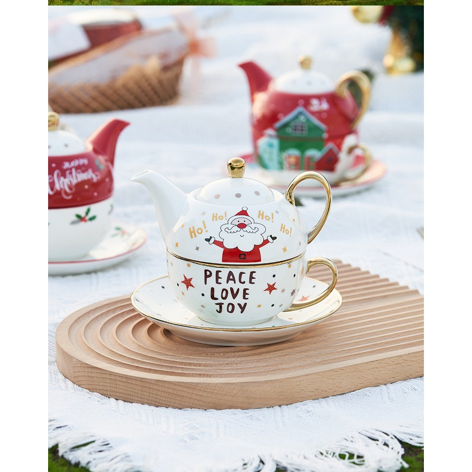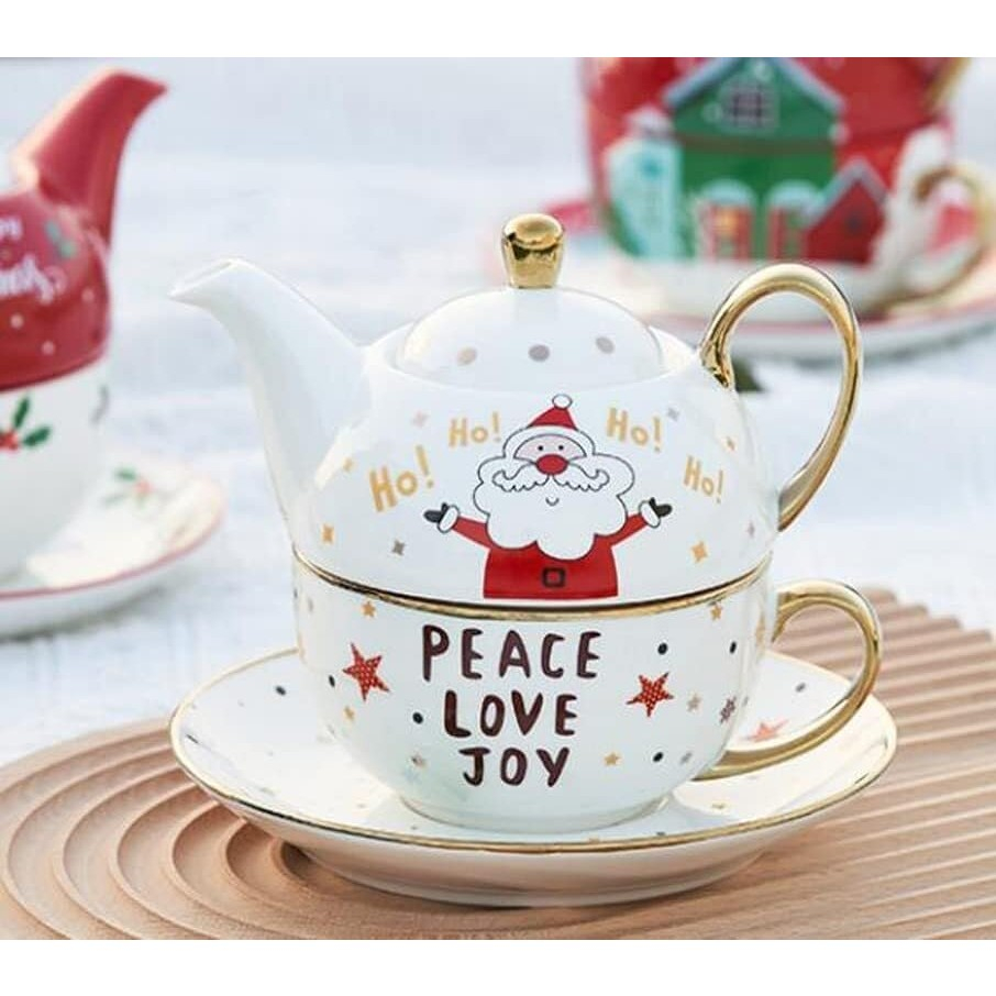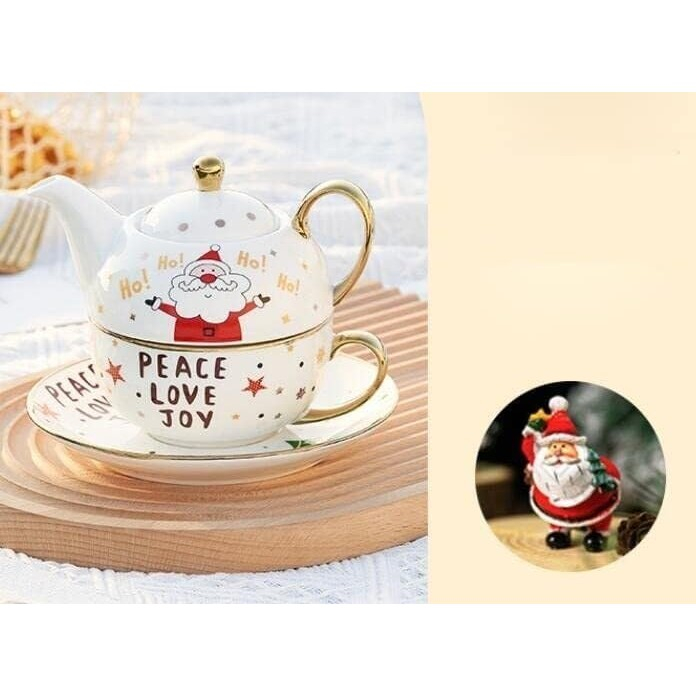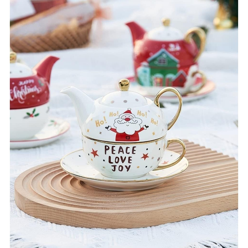 Ceainicul este gândit să se așeze perfect peste cană, economisind spațiu, iar farfuria completează setul pentru o experiență rafinată de servire a ceaiului. Designul festiv aduce o notă veselă și este ideal atât pentru uz personal, cât și pentru a fi oferit cadou de Crăciun sau alte ocazii speciale.