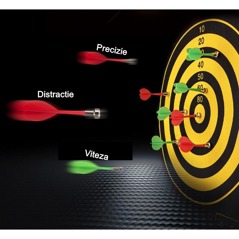 4. Construcție Magnetică și Dimensiuni Ideale: Construcția magnetică facilitează fixarea sagetilor pe tabla de joc în siguranță, prevenind deteriorarea peretelui sau a altor suprafețe. Dimensiunile compacte (37 x 40 cm) fac din acest set o alegere ideală pentru a fi amplasat în diverse spații.